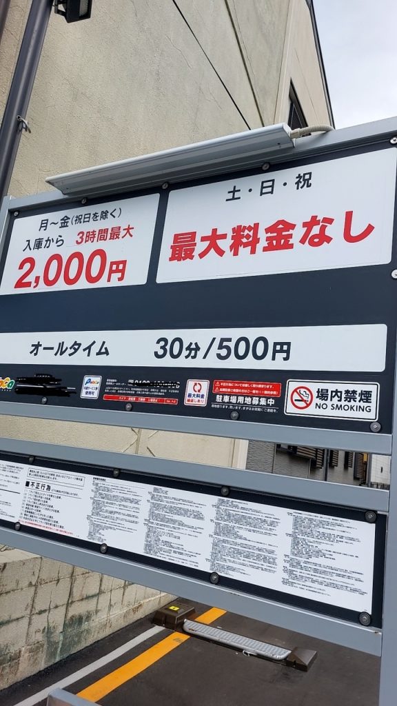 一般的に赤い大きな数字は最大料金がかかれていて一晩止めても二日間で400